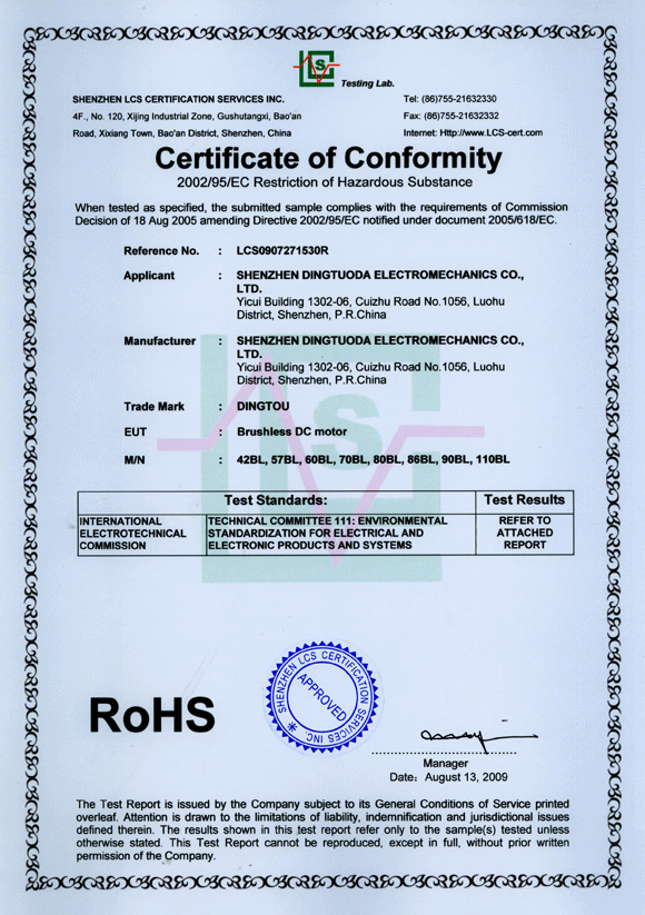 首頁(yè)->產(chǎn)品認(rèn)證->無(wú)刷電機(jī)RoHS認(rèn)證證書(shū)